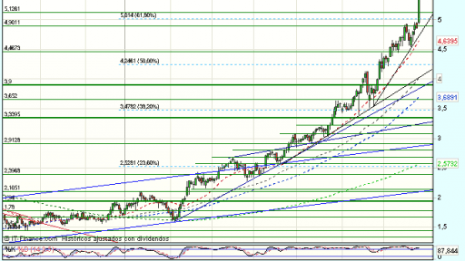 Gamesa se encuentra bajo fortísima presión compradora en la sesión de hoy, y cotiza con beneficios del 13,08%, hasta los 5,4060 euros superando con fuerza y volumen el 61,8% de recuperación de todo el impulso bajista previo desde 2.011.