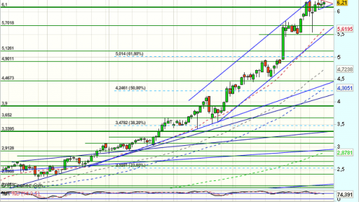 Gamesa se encuentra bajo presión compradora en la sesión de hoy, y cotiza con beneficios del 0,86%, hasta los 6,2090 euros apoyándose en la resistencia relevante superada de los 6,1 euros, que en las últimas sesiones actúa ya como soporte.