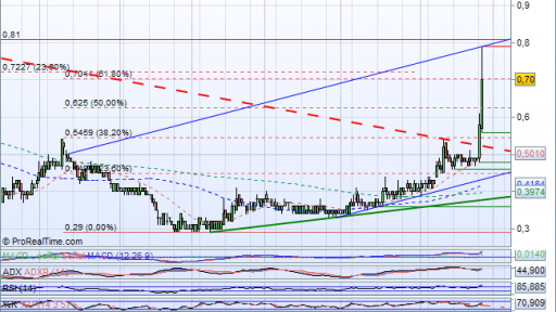 En el medio plazo, encuentra soporte en los 0,29 euros, donde inicia una fuerte fase alcista que se va acelerando en las últimas sesiones, en un fuerte impulso alcista, con notable incremento de volumen, en dirección a los ……….Sigue
