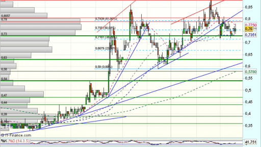 En el medio plazo encuentra soporte en los 0,29 euros, desde donde acelera tendencia sucesivamente, en un fuerte impulso alcista, que encuentra obstáculos en los 0,86 euros, que fuerzan una consolidación hasta los 0,59.