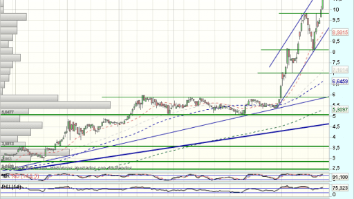 En el medio plazo, tras definir el rango lateral como de continuidad alcista, acelera tendencia, hasta encontrar obstáculos en los 6 euros, que fuerzan una consolidación, en throwback, hacia soportes en los 5,05 euros.