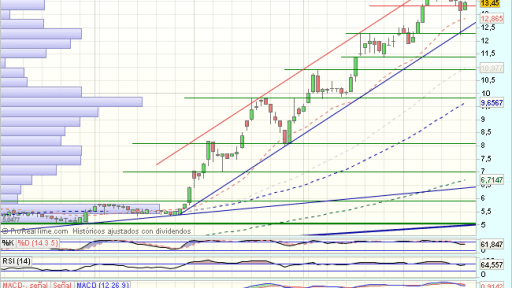 En el medio plazo, tras definir el rango lateral como de continuidad alcista, acelera tendencia, en un fuerte impulso alcista canalizado.