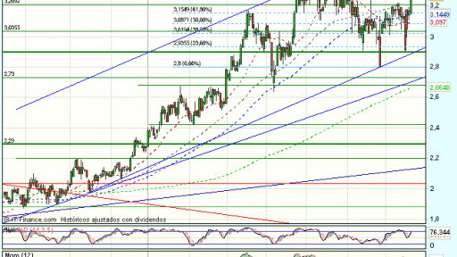 En el largo plazo IAG es bajista, pero en el corto medio plazo, mantiene una positiva tendencia alcista, que va acelerando sucesivamente. En las ultimas sesiones encuentra obstáculos en los 3,4 euros que fuerzan una consolidación hasta los 2,8 euros, desde donde se impulsa nuevamente al alza,