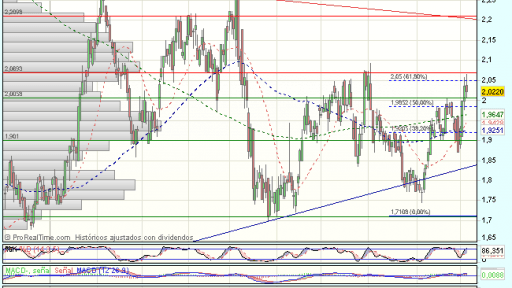 JOSE JUANMiembroCarlos, yo a largo veo al precio en un triángulo cuyo soporte perforó no hace mucho al igual que ahora ha perforado la resistencia. Ultimamente parece englobarse en un canal lateral situandose actualmente el precio en la parte superior. Parece haber divergencias en RSI (que gira a la baja), Estocastico y Momentum. Si supera los 2,1 se podría ir a los 2,3 y 2,41. Si baja hasta superar los 1,94 podría visitar los 1,74
