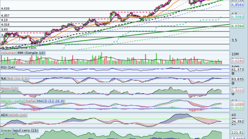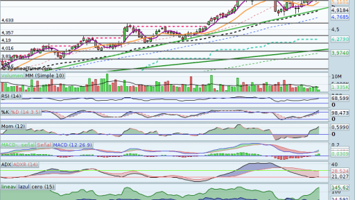 Los osciladores están en zona de sobrecompra mientras el momentun muestra una ligera divergencia bajista.Adjuntos:27 febrero, 2014 a las 17:58 #37421 Adrian_gciaMiembro Adrian_gciaMiembroIAG presenta mañana sus resultados de 2013: previsiones del mercado y claves de la webcast El consenso espera un EBIT de 773 millones de euros A punto de que Iberia alcance la “paz social” total con sus trabajadores (solo falta llegar a un acuerdo con los empleados de tierra), IAG presenta mañana sus resultados de 2013 y el consenso espera un EBIT (comparable) de 773 millones de euros, que los expertos de Banco Sabadell elevan hasta los 776 millones de euros (“beneficiándose de una evolución del precio del petróleo y las divisas favorable”, explican); mientras en Renta 4 prevén que sea de 752 millones. Y añaden que estas magnitudes “incluirán Vueling, que consolida en las cuentas a partir de mayo, por lo que las cifras no serán comparables”. Para el cuarto trimestre, esta última espera “ingresos por pasaje de 4.252 millones de euros; por carga (que debería seguir mostrando debilidad) de 266 millones y otros por importe de 219 millones; en total, ingresos de 4.809 millones de euros (+5,3%)”. Por otra parte, la firma prevé un EBIT antes de costes de reestructuración de 95 millones de euros (vs. +109 millones del consenso). “No esperamos ni costes de reestructuración adicionales por la integración de BMI ni tampoco por Iberia. De este modo, IAG cumpliría con su objetivo de EBIT 2013 de al menos 740 millones (el consenso espera 765 millones). Descontamos EBITDAR de 495 millones, beneficio antes de impuestos 25 millones y beneficio neto 23 millones (tasa fiscal 10%)”, explican estos analistas. Por su parte, Banco Sabadell espera unas ventas para 2013 de 18.965 millones de euros y un beneficio después de impuestos de 146 millones. La entidad catalana explica que el cuarto trimestre habría registrado “una evolución más débil en lo que a ingresos unitarios se refiere (por una base comparativa más compleja y mayor búsqueda de ocupación frente a rentabilidad), algo que creemos que se trasladará a 2014 (sigue siendo clave el guidance que se dé sobre este punto)”. De cara a la webcast de presentación ante analistas, que se celebrará a las 10:00 horas y Bolsamanía seguirá en directo, Renta 4 afirma que estarán “atentos a los comentarios sobre el proceso de reestructuración de Iberia (…) También estaremos pendientes de las perspectivas 2014, que deberían mostrar una senda alcista para cumplir con los objetivos del plan estratégico”. El bróker español aconseja mantener el valor, con precio objetivo de 5,3 euros. 28 febrero, 2014 a las 9:24 #37443 Adrian_gciaMiembro Adrian_gciaMiembroInternational Airlines ha publicado un beneficio operativo antes de extraordinarios de 770 millones de euros en 2013, ligeramente por encima de las previsiones de los analistas. Los ingresos del ejercicio aumentaron un 3,1% hasta 18.675 millones de euros y los ingresos unitarios de pasaje aumentaron un 0,6% durante el ejercicio (3,7% a tipos de cambio constantes) 5 marzo, 2014 a las 11:05 #37746 Adrian_gciaMiembro Adrian_gciaMiembroIAG: Deutsche Bank analiza las implicaciones de la crisis Rusia-Ucrania y las perspectivas de Pascua Reiteran hoy miércoles los analistas de Deutsche Bank su consejo de comprar, con precio objetivo de 506 peniques para IAG y analizan las perspectivas de las aerolíneas para Pascua, así como las posibles implicaciones de la crisis Ucrania-Rusia para el sector. Consideran estos expertos que “en términos financieros ninguna de las compañías del sector bajo nuestra cobertura tiene una exposición relativamente baja a la región”; si hablamos de la capacidad, la firma señala a Lufthansa como la más expuesta (1,3% del total a Rusia y 0,4% Ucrania). Las cifras para el resto de grupos son la siguientes: IAG (0,7% y 0,1%, respectivamente), Air France KLM (0,6% y 0,2%), easyJet (0,2% y 0,00%) y Rayanair (ninguna exposición). “En general, creemos que el riesgo en la parte alta del balance es relativamente moderado. Más interesante quizá sea el impacto en los costes”, explican, ya que el precio del crudo ha repuntado con la escalada de tensiones entre ambos países. Si bien, señalan, las aerolíneas suelen estar generalmente bien cubiertas contra los picos puntuales del petróleo: por este orden, Air France, Lufthansa, easyJet, IAG y Rayanair, colocan a las compañías de mayor a menor impacto. Escaso efecto tienen, por tanto, los acontecimiento del Este de Europa en el sector aéreo, por lo que Deutsche Bank destaca también que los ejecutivos de estas corporaciones “han estado hablando de mayores picos de demanda y de un incremento en la proporción de beneficios procedentes de las reservas de última hora: “Esto significa que los eventos especiales, como la Pascua, van a ser cada vez más importantes para la rentabilidad, aunque son más difíciles de predecir. Desde una perspectiva de la rentabilidad”, afirma el bróker germano, “podemos ver claramente que este periodo ‘vacacional’, por ejemplo para easyJet, parece ser más positivo desde que sus precios tocaron techo en verano y Navidad”. A estas horas: Adjuntos:6 marzo, 2014 a las 12:20 #37854 Adrian_gciaMiembro Adrian_gciaMiembroIAG transportó en febrero 4,7 millones de pasajeros, un 30,5% más: la demanda de Iberia cayó un 4,3% IAG transportó en febrero un total de 4,7 millones de pasajeros, lo que supone un incremento del 30,5% con respecto a los 3,6 millones del mismo mes de 2013. En el acumulado enero-febrero, la mejora es del 29,8%, hasta los 9,6 millones, desde los 7,4 millones previos. En base comparable los incrementos fueron del 7,4% y del 6,9%, respectivamente. Al mismo tiempo, el coeficiente de ocupación en pasaje mejoró en 0,1 puntos porcentuales, hasta situarse en el 75,3% en febrero; y en 0,2 puntos porcentuales en el acumulado de los dos primeros me
