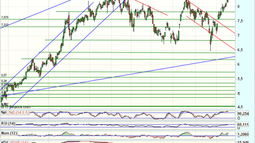 En e medio plazo, IAG mantiene una positiva tendencia alcista, que va acelerando sucesivamente hasta los 8,55 euros, que fuerzan un trhrowback a soportes.