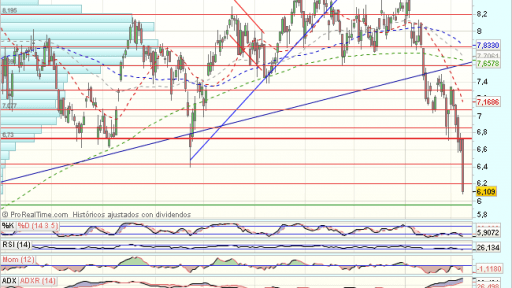 En e medio plazo, IAG mantiene una positiva tendencia alcista, que va acelerando sucesivamente hasta los 8,55 euros, que fuerzan un trhrowback a soportes en 6,5 euros.