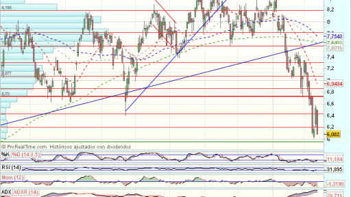 En e medio plazo, IAG mantiene una positiva tendencia alcista, que va acelerando sucesivamente hasta los 8,55 euros, que fuerzan un trhrowback a soportes en 6,5 euros.