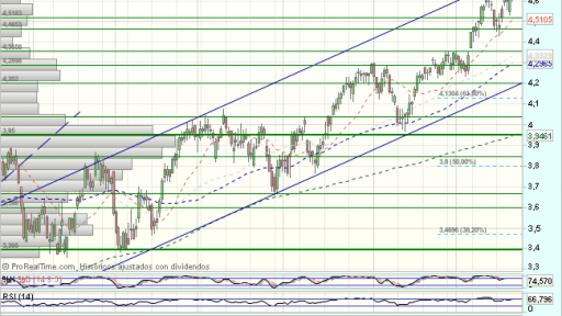En el medio plazo define el rango lateral como de continuidad alcista, para pasar a moverse dentro de un impulso alcista canalizado.