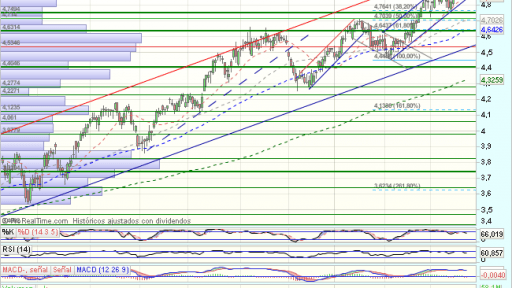 En el medio plazo define el rango lateral como de continuidad alcista, para pasar a moverse dentro de un impulso alcista canalizado.