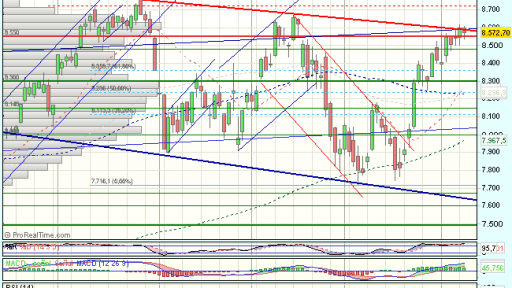 El Ibex 35 se mantenía volátil en la sesión de hoy, aunque aparecieron las compras en el soporte de los 8.550 puntos, y terminaba cerrando con perdidas del 0,28%, en los 8.572,70 puntos, nuevamente frenado ante la resistencia de los 8.600 puntos, que llego a superar durante la sesión.