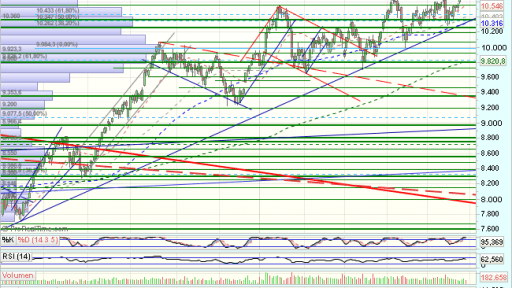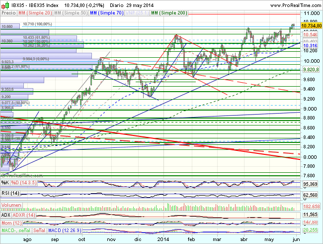 La sesion de hoy no cambia demasiado las cosas y el Ibex mantiene la superacion de la resistencia y máximos previos en los 10.705 puntos, abriendo nuevos objetivos en los 11.000 – 11.210 puntos.
