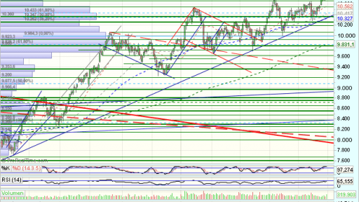 Por lo que se refiere al aspecto técnico del Ibex, en el medio plazo, desarrolla un impulso alcista, hasta los 10.650.