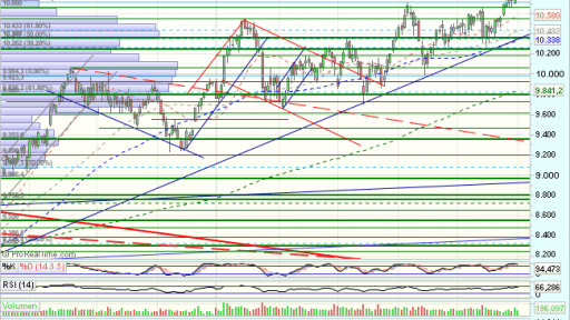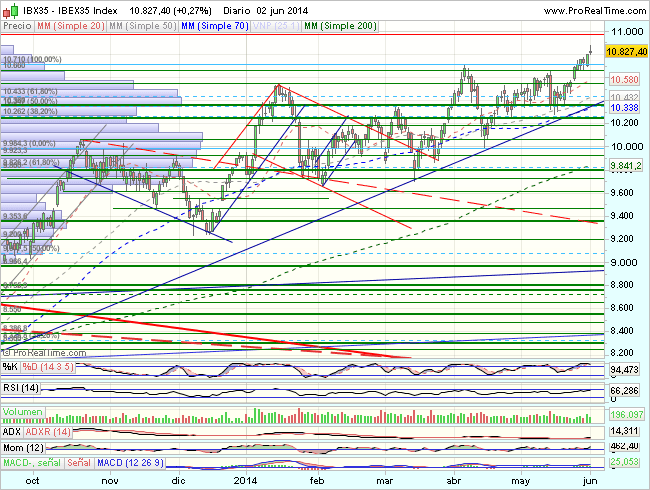 Por lo que se refiere al aspecto técnico del Ibex, en el medio plazo, desarrolla un impulso alcista, hasta los 10.650.