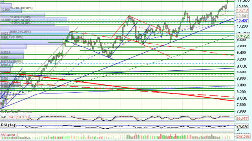 La sesion no cambia demasiado las cosas y el Ibex, mantiene su aspecto alcista, con objetivos en los 11.210 – 11.500 puntos .
