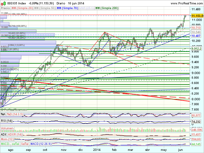 Por lo que se refiere al aspecto técnico del Ibex, en el medio plazo, desarrolla un impulso alcista, hasta los 10.650.
