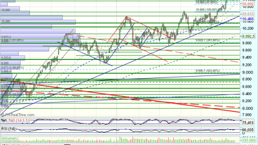 Por lo que se refiere al aspecto técnico del Ibex, en el medio plazo, desarrolla un impulso alcista, hasta los 10.650.