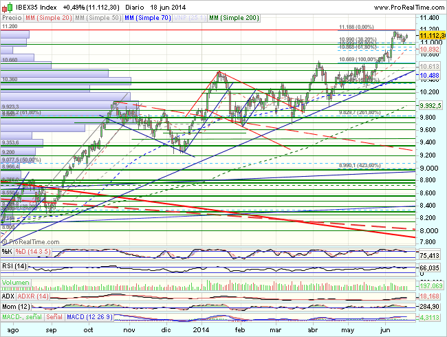 El soporte en los 11.000 puntos, sigue aguantando y mientras no lo pierda, con un filtro a 10.875, por lo que podemos hablar de un correccion minima del 38,2%. la tendencia alcista se mantiene.