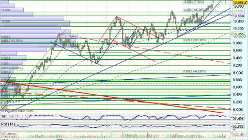 Por lo que se refiere al aspecto técnico del Ibex, en el medio plazo, desarrolla un impulso alcista, hasta los 10.650.
