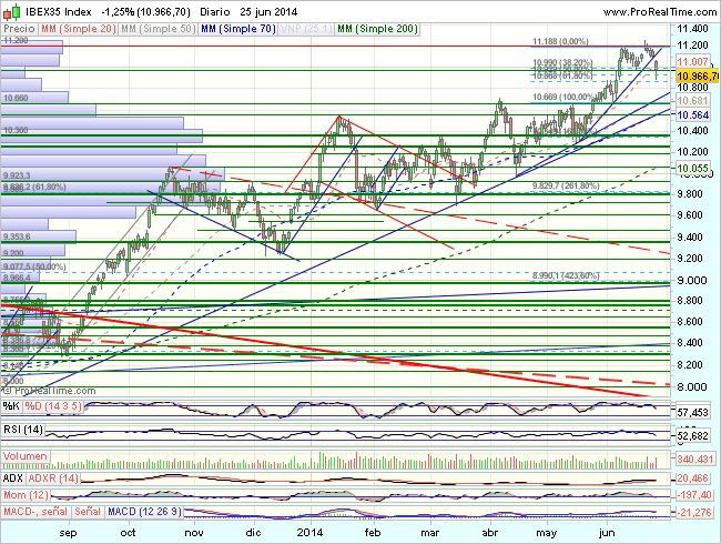 La sesion dibuja una figura de vuelta preocupante y con gap bajista, que ha perforado el soporte en los 11.000 puntos, por lo que hay que extremar la prudencia y vigilar los 10.875 puntos que nos confirmarian una mayor correccion.