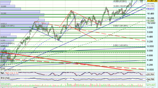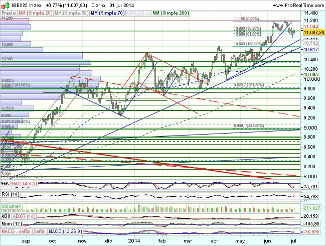 El Ibex, recupera el soporte en los 11.000 puntos, por lo que es probable que la ruptura se produjera en falso y el Ibex siga su camino en direccion a los 10.200 puntos.