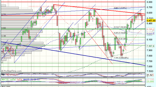 El Ibex 35 se mantenía bajo presión vendedora en la sesión de hoy, con el sector bancario a la cabeza, aunque aparecieron las compras en el entorno de los 8.400 puntos que aminoraron los números rojos, y terminaba cerrando con perdidas del 1,01%, en los 8.457,80 puntos, por debajo del soporte de los 8.500 puntos.