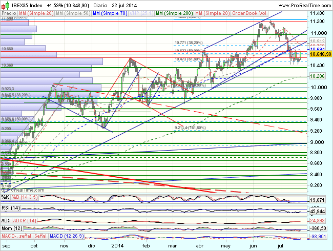 Por lo que se refiere al aspecto técnico del Ibex, en el medio plazo, desarrolla un impulso alcista, hasta los 11.200.