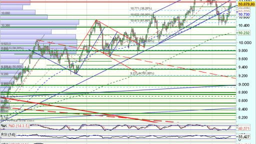 La sesion de hoy no cambia demasiado las cosas, los 10.850 puntos, son ahora soporte, del impulso alcista hacia maximos.