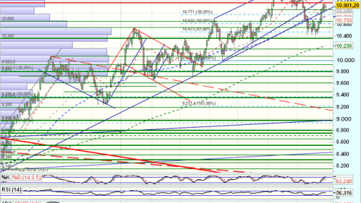 La sesion de hoy no cambia demasiado las cosas, los 10.850 puntos, aguantan y el impulso alcista sigue su curso hacia maximos.