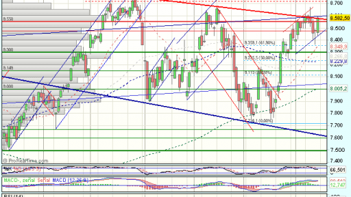 El Ibex 35 iniciaba la sesión de hoy bajo presión vendedora, aunque rápidamente presionaron las compras en el entorno de los 8.440 puntos, llevando al índice al verde, y terminaba cerrando con ganancias del 1,27%, en los 8.582,50 puntos, superando la resistencia de los 8.550 puntos.