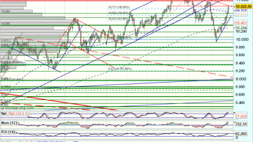 El Ibex. matiene su fortaleza, en la proxima sesion ha de enfrentarse a la directriz bajista y resistencia estatica de los 10.850 puntos, si no lo frena, veremos continuidad del impulso alcista hacia maximos.