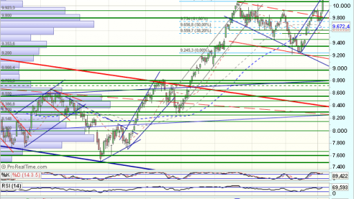 El Ibex cerraba la sesión de hoy, con alzas del 2,93% y notable incremento de volumen, fuerte vela alcista de cuerpo real y cierre cercano a máximos, con lo que supera con sobresaliente, los máximos de 10.063,90 y da continuidad alcista al movimiento en dirección a los 10.500 – 11.000 puntos