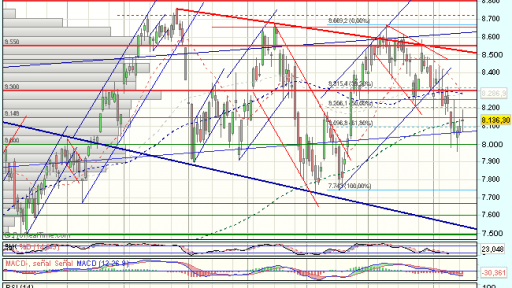 El Ibex 35 se mantenía bajo presión compradora la sesión de hoy, aunque aparecieron con fuerza las ventas en el entorno de los 8.200 puntos que aminoraron las ganancias, y terminaba cerrando con beneficios del 0,81%, en los 8.136,30 puntos, por debajo de la resistencia clave en los 8.150 puntos, que llego a perforar durante la sesión.