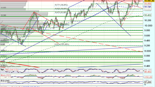 El Ibex mantiene su aspecto alcista, aunque las resistencias se muestran fuertes, por lo que lo mas probable, es que veamos continuar el movimiento consolidativo.