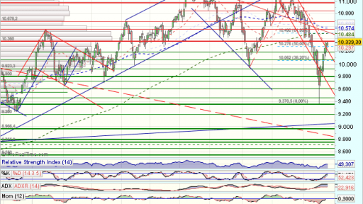 El Ibex continua con su formacion de vuelta en V, y es logivo que dude ante la resistencia de largo plazo en los 10.350 puntos, una vez superada, dara continuidad al rebote, si bien, tendriamos que ver precios sobre los 10.700 puntos, para confiar en aun ataque a maximos.