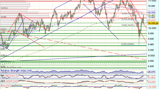 El Ibex se ha enfrentado hoy a niveles de resistencia muy importantes, media de 200, 61,8% de recuperacion y los 10.500, dificiles de pasar a la primera y que justamente han rechazado los precios, aunque no se ha roto niveles importantes, por lo que mientras se mantenga sobre los 9.950 puntos, es probable la continuidad del impulso alcista.