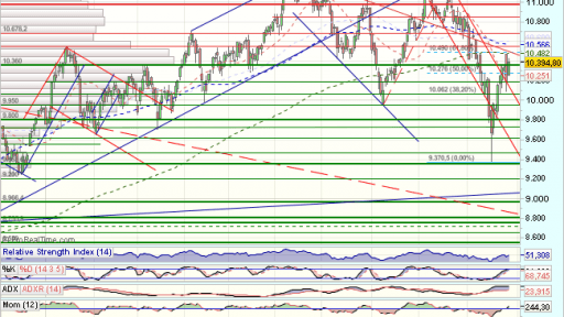 El Ibex ,tras el paron lógico en niveles de resistencia muy importantes, media de 200, 61,8% de recuperación y los 10.500, difíciles de pasar a la primera, consigue situarse sobre la resistencia de los 10.350, que de confirmar en próximas sesiones, nos avisaría de la continuidad del impulso alcista.