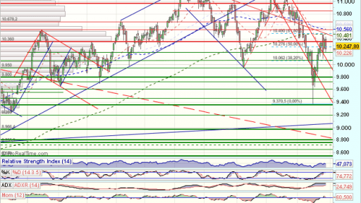 El Ibex ,sigue frenado en niveles de resistencia muy importantes, media de 200, 61,8% de recuperación y los 10.500, difíciles de pasar a la primera, y esta desarrollando un rango lateral. Seria necesario ver precios sobre los 10.500 para pensar en la continuidad de las subidas.