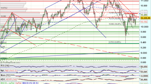 El Ibex, sigue dentro del rango lateral con techo en la media de 200 sesiones y resistencia en los 10.500 puntos, mientras esta no sea superada, no veremos continuidad en las subidas.