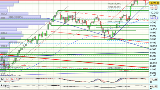 El Ibex cerraba la última sesión, con perdidas del 0,75% en los 10.279,70, amenazando el nivel relevante de los 10.250 puntos. En la sesion de ha apoyado en la base del canal alcista de corto, y el aspecto técnico sigue siendo alcista y aunque no es descartable que prosiga el movimiento de consolidación, este en principio debiera ser limitado.