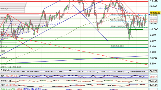 El Ibex ataca con fuerza el techo del rango lateral y la media de 200 sesiones y que aun no puede darse por superado, de confirmar en las proximas sesiones sobre los 10.675, veremos continuidad en las subidas en direccion a máximos.