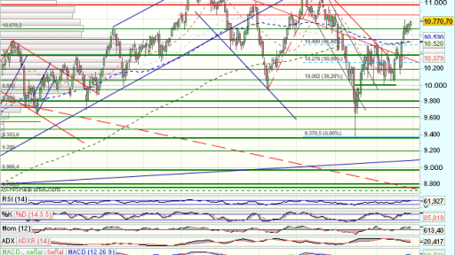 Por lo que se refiere al aspecto técnico del Ibex, en el medio plazo, desarrolla un impulso alcista, hasta los 11.200.