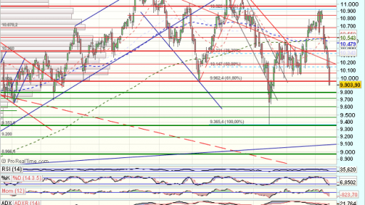 El Ibex sigue mostrando una acusada debilidad y perfora con fuerza soportes con la perdida de l de los 9.950, mantiene la aceleracion del impulso bajista, hacia el soporte de los 9.350 puntos.