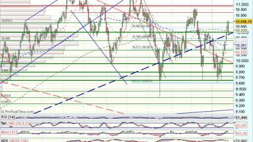 El Ibex confirma la superacion de la resistencia clave de los 10.500 puntos, la media de 200 sesiones, y el 61,8% de recuperacion de todo el impulso bajista previo desde los 11.200, por lo que es de esperar un proximo ataque a maximos.