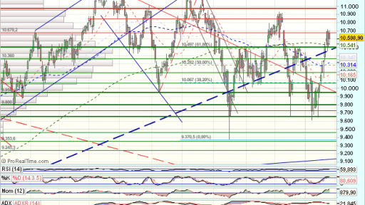 A pesar de la caida de hoy, el Ibex se mantiene sobre la resistencia superada de los 10.500 puntos y la media de 200 sesiones, y es de esperar continuidad alcista, la perdida de los 10.450 puntos por el contrario, nos avisaria de una mayor consolidacion.