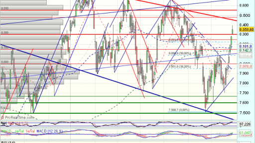 El Ibex 35 se mantenía durante la sesión del viernes bajo presión compradora, apoyado en la resistencia relevante, ahora soporte, de los 8.300 puntos, y terminaba cerrando con beneficios del 0,86%, en los 8.353 puntos, cerrando así una semana muy positiva, en la que el índice avanzó un 5,2%.