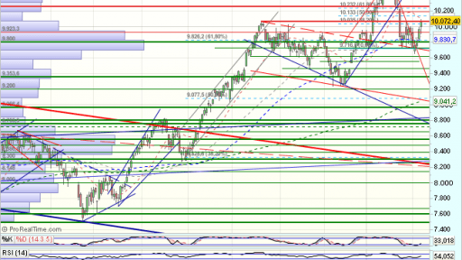 El Ibex cerraba la sesión, con beneficios del 1,08% en los 10.072,40 puntos, ligeramente por encima de la resistencia de los 10.063 puntos, cuya superación aun no podemos dar por confirmada, de hacerlo en próximas sesiones abriría la vía para nuevas alzas, en dirección a los 10.550 – 11.000 puntos.