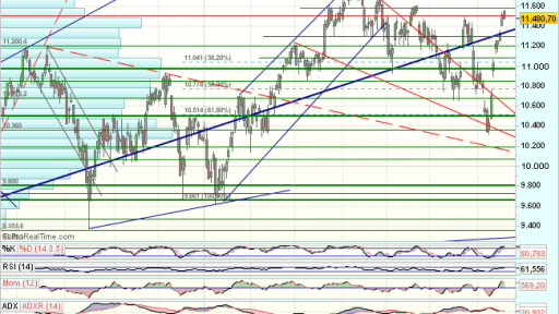 Por lo que se refiere al aspecto técnico del Ibex, en el medio plazo, tras encontrar soportes en los 6.738 puntos, desarrolla un impulso alcista, hasta los 11.200, que fuerzan una consolidación.