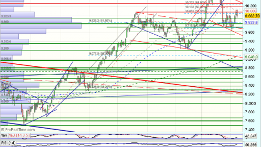 El Ibex cerraba la sesión, con perdidas del 0,89% en los 9.982,50 puntos, en principio un trhowbak a soportes, logico tras las subidas de los ultimos dias y que no cambian el aspecto alcista, con objetivos en los 10.550 – 11.000 puntos.