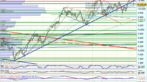 La sesión de hoy nos confirma la debilidad del indice y el aspecto tecnico del indice ha empeorado notablemente para el corto plazo, por lo que es de esperar, la continuidad de la correccion hacia los 9.800 puntos.